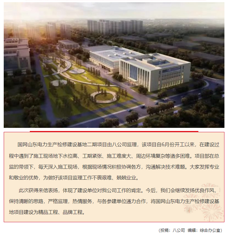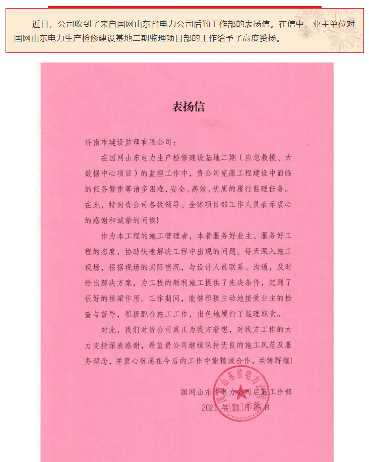 国网山东电力生产检修建设基地二期监理项目部收到业主来信表扬